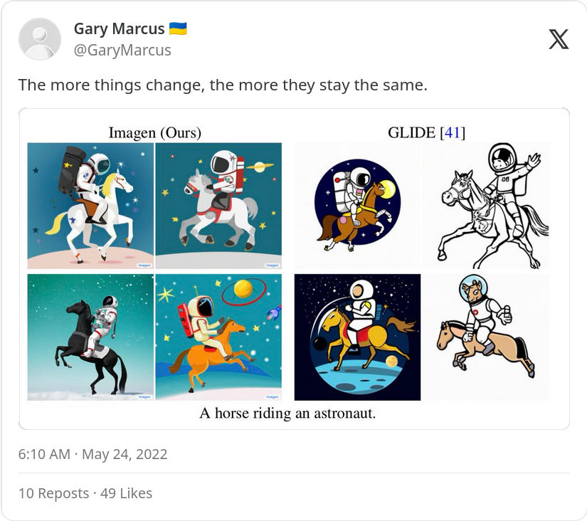 There's an old Gary Marcus post from 2022 about how AI image generators can't really understand anything and can't produce anything that's not already in their training data. As an example, he prompts for a horse riding an astronaut. Inevitably, the models produce an astronaut riding a horse.